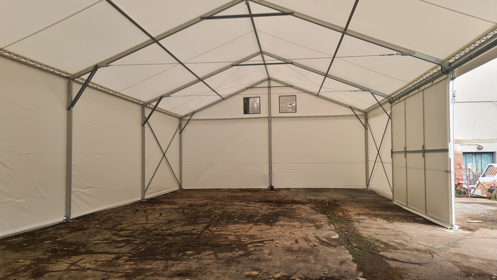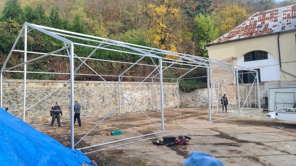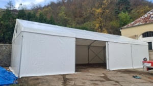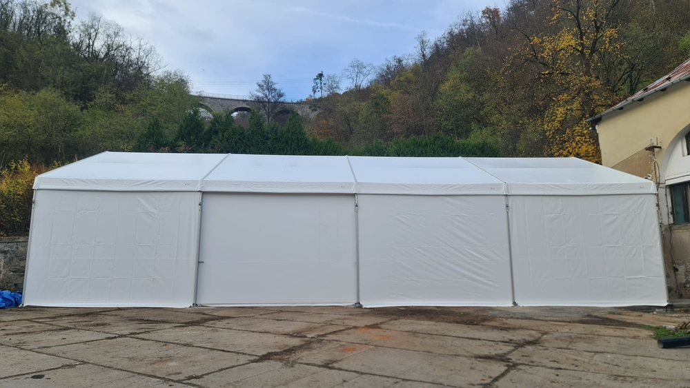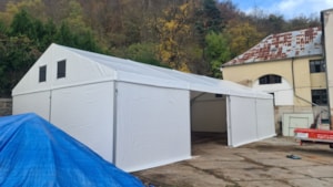 Konštrukcia pre spoločnosť Formann z Jílovej u Prahy. Pôdorys 10 x 20 m so bočnou stenou 4 m. Ide o štandardný dizajn stanovej haly. Vybavená bočnými posuvnými dverami. Dvere na oceľovom ráme, pokryté PVC plachtou. Dvere sú zavesené na oceľovej nosnej konštrukcii. Pohyb zabezpečujú priemyselné oceľové kladky s koľajnicou typu „C“. Voľná výška dverí je znížená okapom strešnej plachty. Voľný vstupný otvor má preto rozmery 3,6 x 5 m. Ovládanie je ručné s malou silou. Veľmi funkčné riešenie.