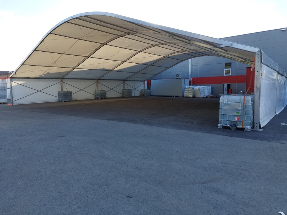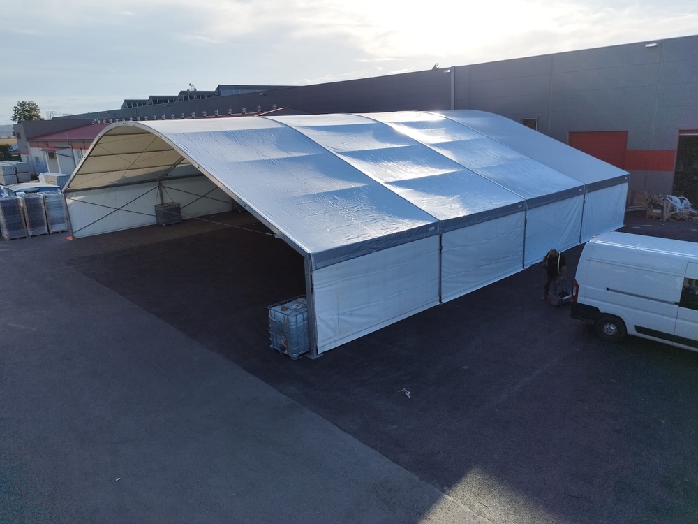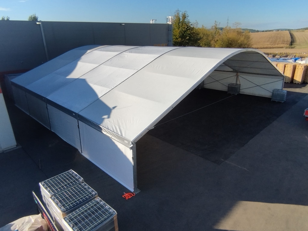 Máme mobilný strešný systém, ktorý môže zakryť skladové priestory rôznych šírok a dĺžok. Tu je príklad rýchlej strešnej konštrukcie s rozmermi 20 x 20 m, výškou stien 4 m a plachtovým obložením. Strecha bola postavená za jeden deň a môže sa ihneď používať na svoj účel. Postavená na voľnom asfaltovom povrchu bez potreby ukotvenia. To je zabezpečené pomocou vodných nádrží.