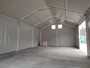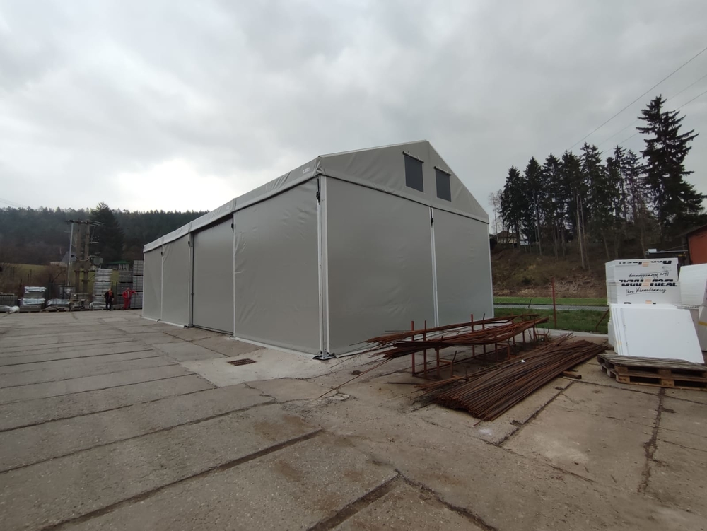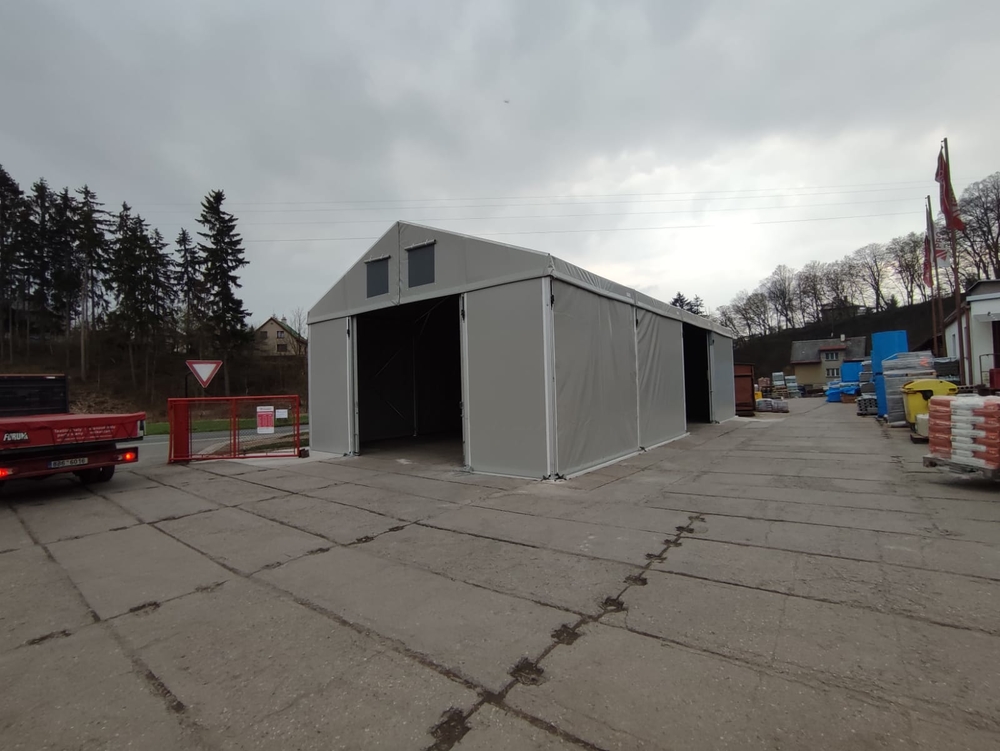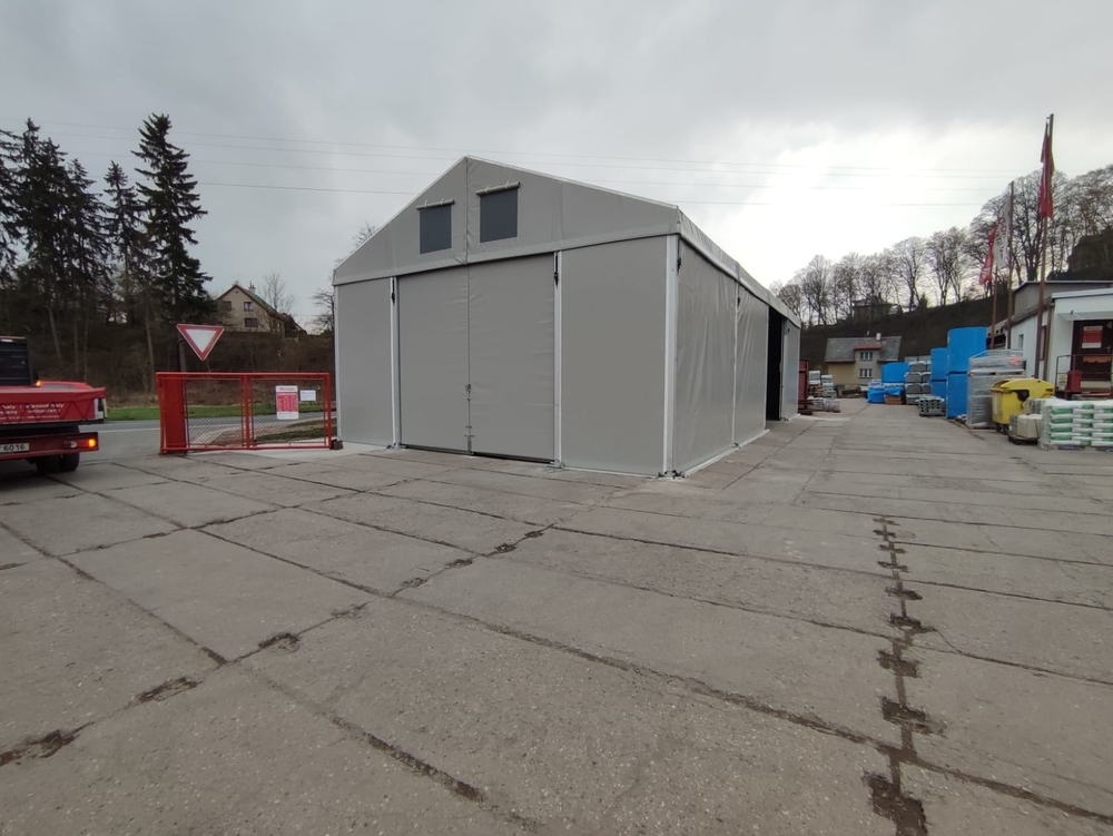 Projekt pre spoločnosť Pro Doma z Úpice. Menšia stanová hala, celá v šedej farbe. Rozmery 8 x 16 m, odkvap 4 m, posuvné dvere v strede prednej časti a po bokoch. Pri tomto dizajne je dôležité poznamenať, že sivá farba je menej priepustná pre svetlo ako biela. Preto je počas dňa vo vnútri haly menej svetla ako pri štandardnej bielej streche. Výsledný dizajn je však menej nápadný.