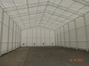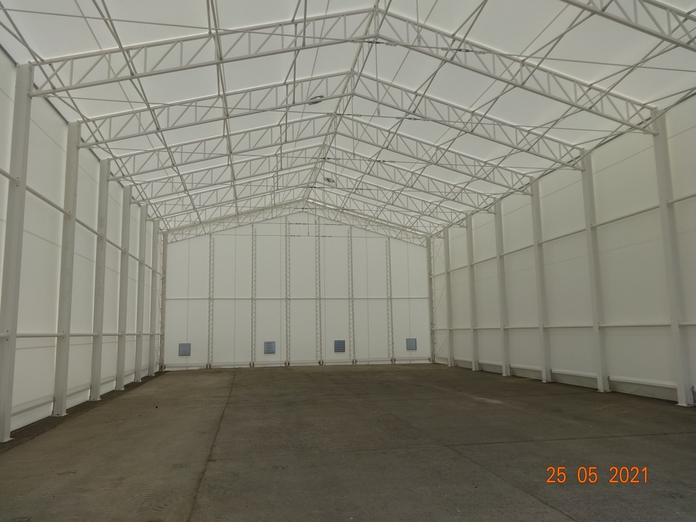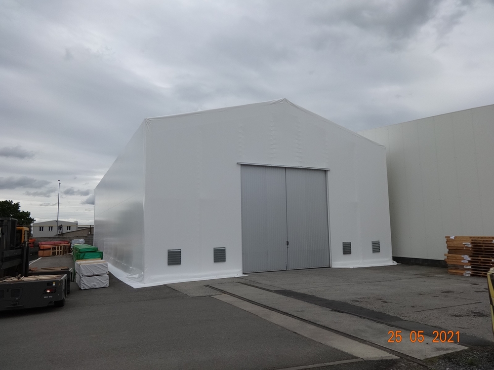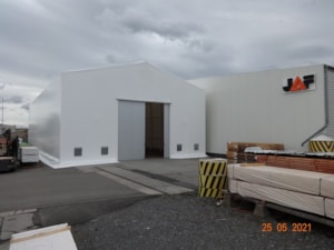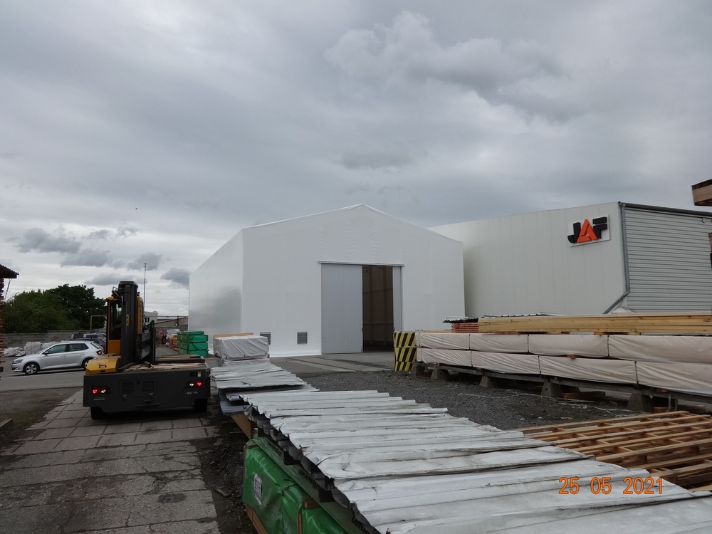 V spolupráci s kvalitnou českou oceliarskou spoločnosťou sme dodali spoločnosti JAF Holz vo Vyškovi pevnú oceľovú halu s jedným plachtovým opláštením. Konštrukcia je natretá bielou nehorľavou farbou, opláštená vysokopevnostnou plachtou Sioen, postavená na starej betónovej ploche vyrovnanej konštrukciou. Oceľová hala 15x30m, výška bočnej steny 7m, predné centrálne dvere. Ak máte záujem o takéto robustné riešenie, sme vám k dispozícii :).