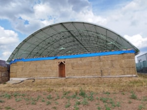 Veľmi špecifická budova pána Navrátila v Drásove bola pokrytá plachtovou strechou. Budova má pôdorys 20 x 30 m so slamenými stenami a oceľovou klenutou strešnou konštrukciou. Po konzultácii s klientom bol navrhnutý systém napínania a ukotvenia plachtového obloženia. Bola použitá plachta najvyššej kvality Serge Ferrari Flexlight Perform 702 S2 s životnosťou viac ako 20 rokov. Špecifický napínací systém vnútorných expandérov a koľajníc zabezpečuje absolútne napnutie plátna vo všetkých častiach strechy, štítov a zasúvateľných predných striech. Plátno tak úplne nahrádza vlastnosti pevných strešných materiálov, ako je plech. Dokončené k spokojnosti všetkých.