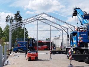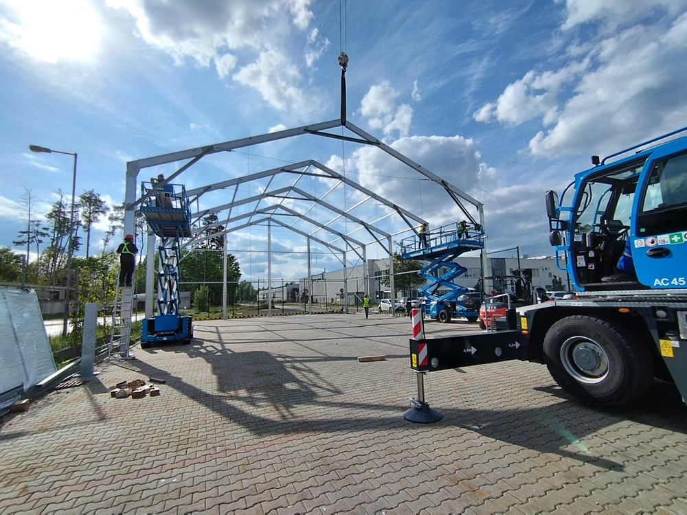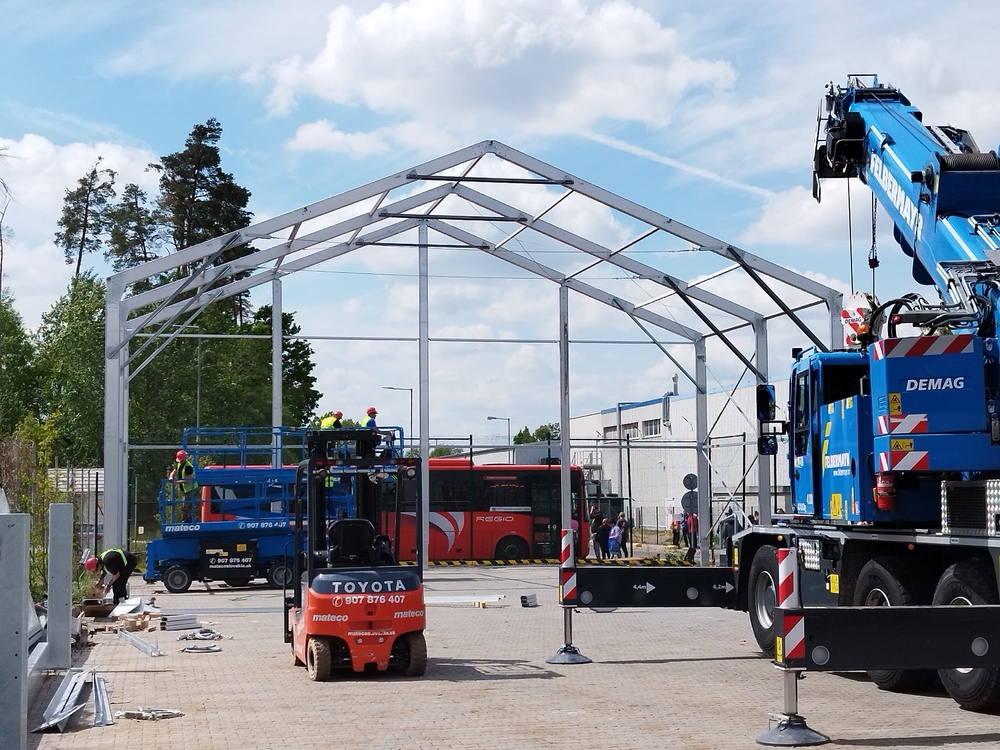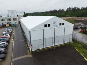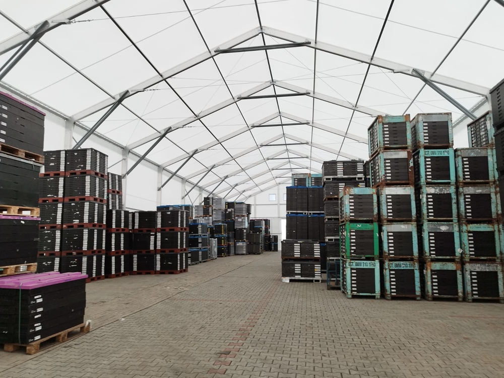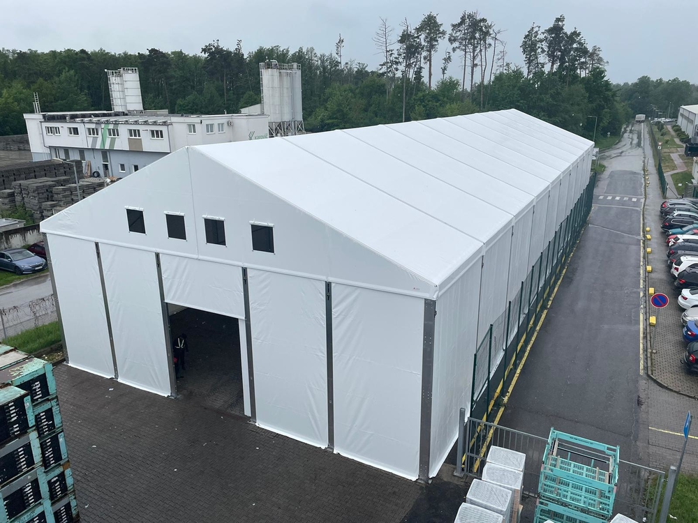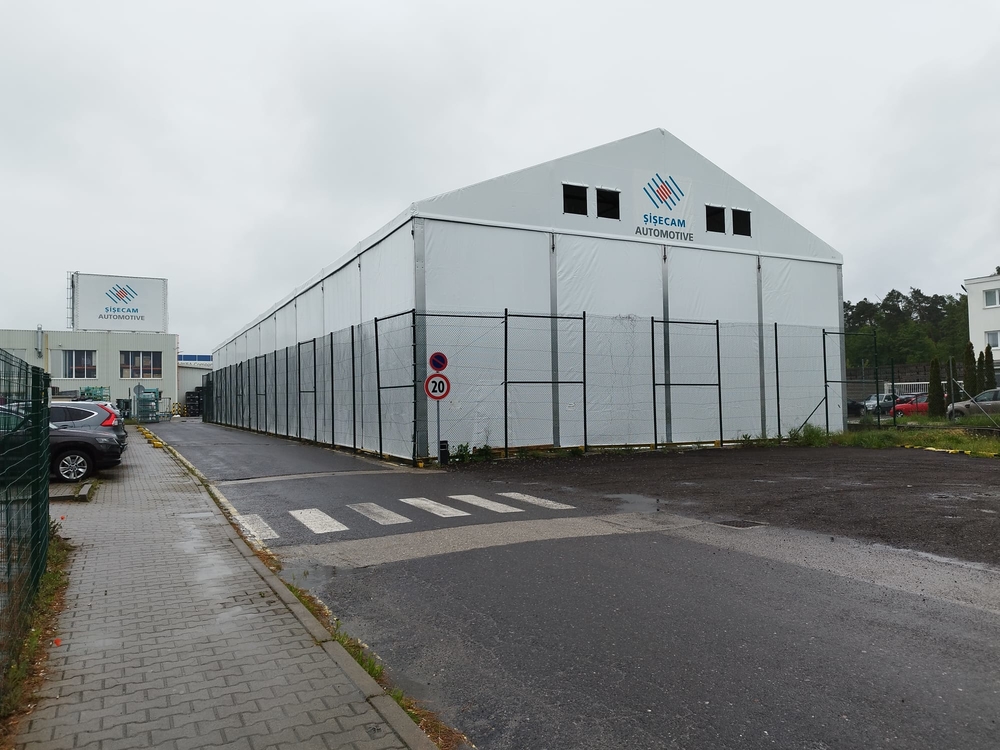 Tento špeciálny model, vyrobený pre spoločnosť Sisecam z Malack, má nasledujúce rozmery: šírka 17 m, dĺžka 50 m, výška steny 6–6,7 m v závislosti od sklonu šikmej plochy budovy. Plachtová hala je vybavená prednými dverami a núdzovým východom. Konštrukcia je vyrovnaná podľa sklonu povrchu budovy a vybavená zámkovou dlažbou. Možnosť skladovania prepravných debien do výšky 6 m! Vnútorný priestor je úplne voľný bez obmedzení a nie je zmenšený vnútornou konštrukciou, ktorá nie je priehradová, ale vyrobená z uzavretých profilov, ktoré nezasahujú do skladovacieho priestoru.